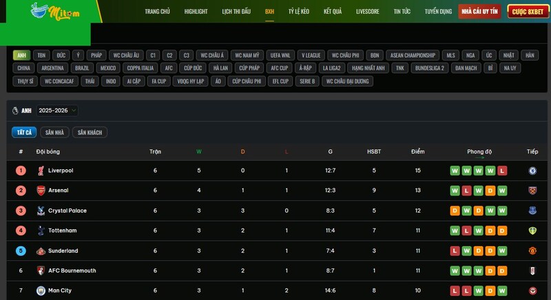 Tại Mi Tom TV, bảng xếp hạng luôn được cập nhật gần như ngay lập tức sau khi trọng tài thổi còi mãn cuộc. Chỉ cần một cú click, anh em sẽ thấy: