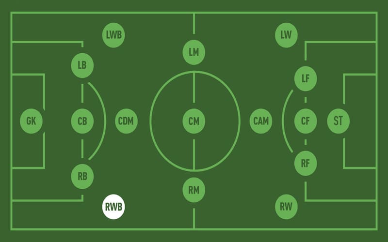 Nhiều người không biết về vị trí RWB khi đọc thông tin về đội bóng, vậy RWB trong bóng đá là gì? RWB là viết tắt của cụm từ Right Wing Back, nghĩa là hậu vệ cánh phải dâng cao. Đây là vị trí thường xuất hiện trong các sơ đồ chiến thuật có ba trung vệ như 3-4-3, 3-5-2 hoặc 3-4-2-1.
